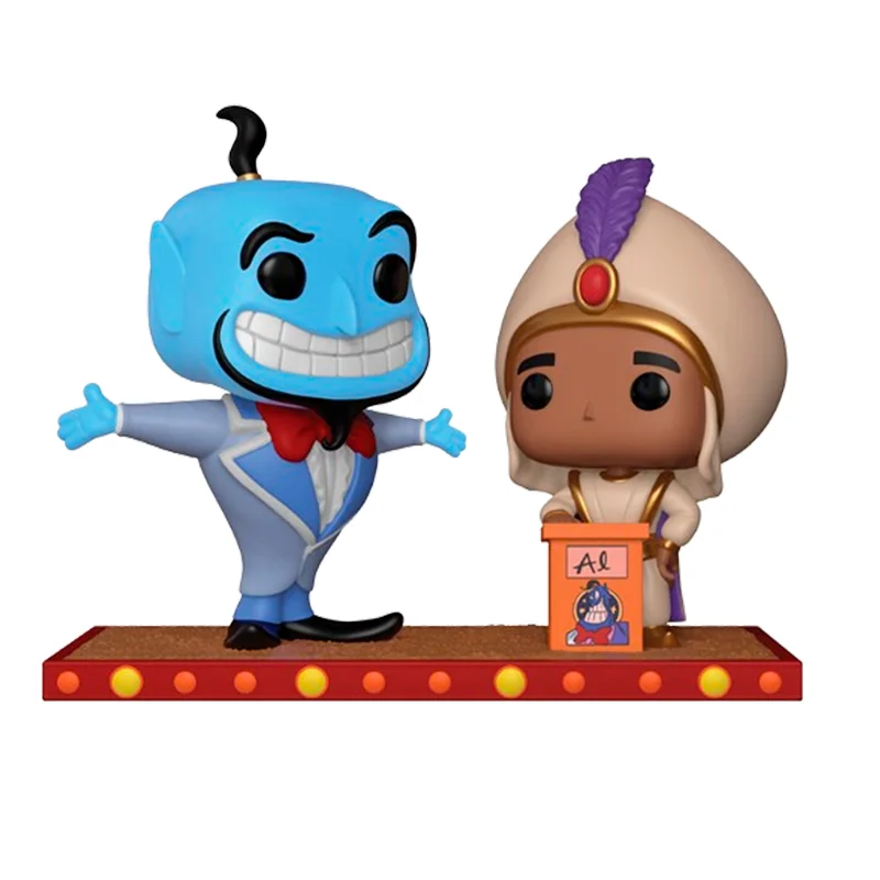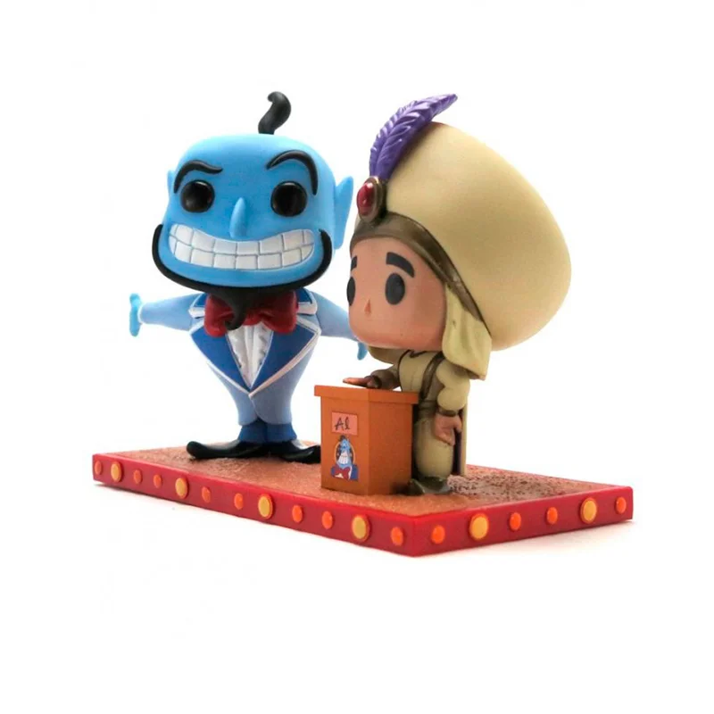 Este Funko 409 es especial ya que se trata de una versión moment, es decir, una replica de una escena de la película, en la que los dos personajes están encima de un escenario con un pequeño atril. Además, se muestra a el Genio sonriente con los brazos abiertos y Aladdin un poco serio.