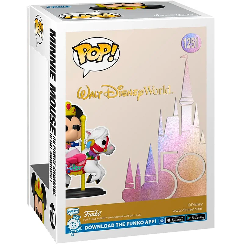 El diseño del Funko 1251 es especial ya que se trata de una edición del 50 aniversario. Además, la figura representa al a Minnie con vestido de princesa, corona dorada montada sobre un caballo blanco del tiovivo.