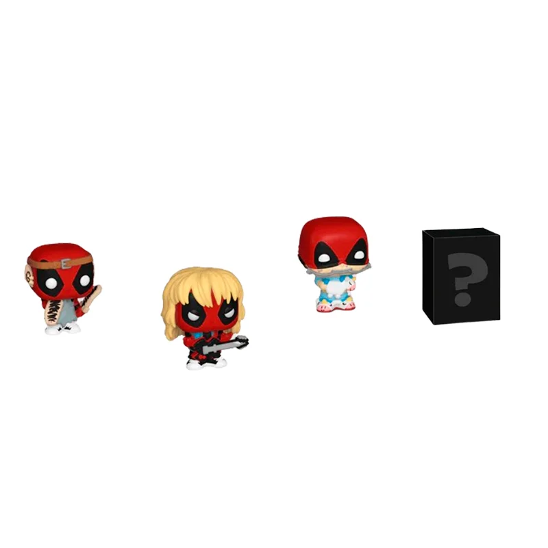 La colección especial de 2.5 centímetros de tamaño compuesta por BITTY POP Deadpool, se trata de mini Funko con cajita y número de modelo escrito. En cada blíster se encuentran cuatro figuras, tres que se muestran y una random o rara que no se muestra en la caja, solo al abrirla. Cada estuche se puede abrir por la parte inferior y todos ellos se unen en cajas de metacrilato de 4 unidades.