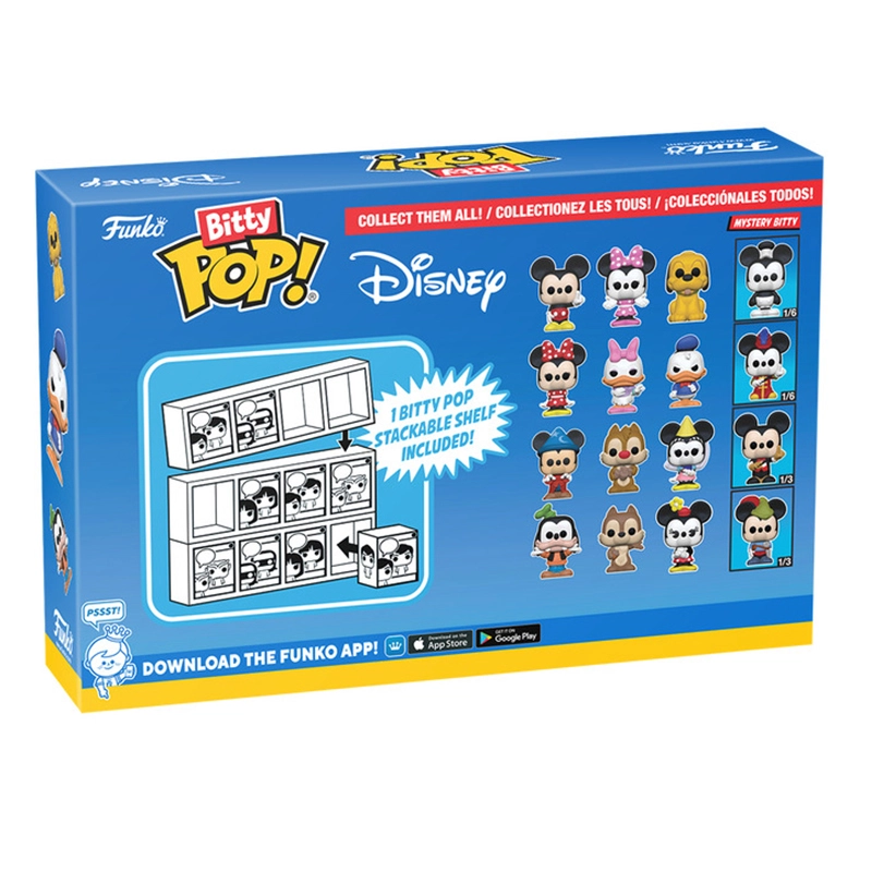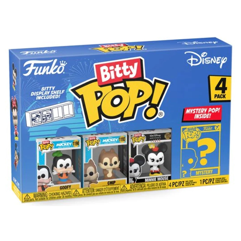 La colección especial de 2.5 centímetros de tamaño compuesta por BITTY POP Goofy, se trata de mini Funko con cajita y número de modelo escrito. En cada blíster se encuentran cuatro figuras, tres que se muestran y una random o rara que no se muestra en la caja, solo al abrirla. Cada estuche se puede abrir por la parte inferior y todos ellos se unen en cajas de metacrilato de 4 unidades.