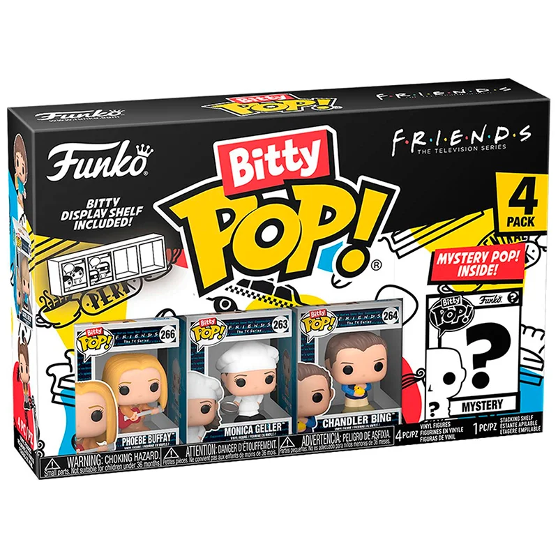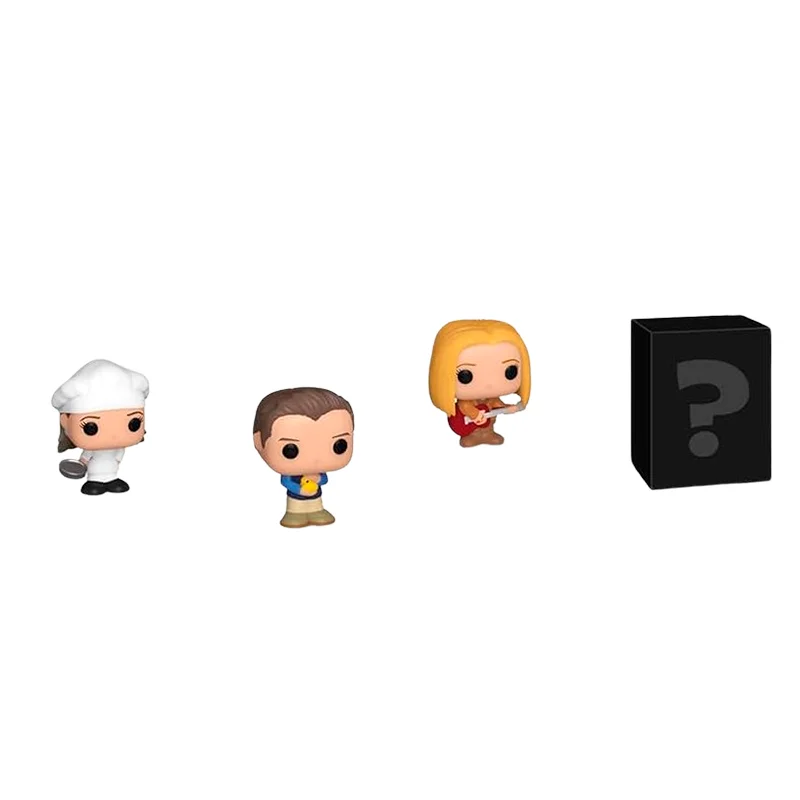 Este Bitty tienen de especial que son adaptaciones de figura Funko Pop en un tamaño de 2.5cm, incluso más pequeños que los keychain o llaveros. No puedes quedarte sin los Bitty Phoebe , en tu colección de Friends. Este pack de 4 esta compuesto por Phoebe Buffay, Monica Geller, Chandler Bing y ¡sorpresa!