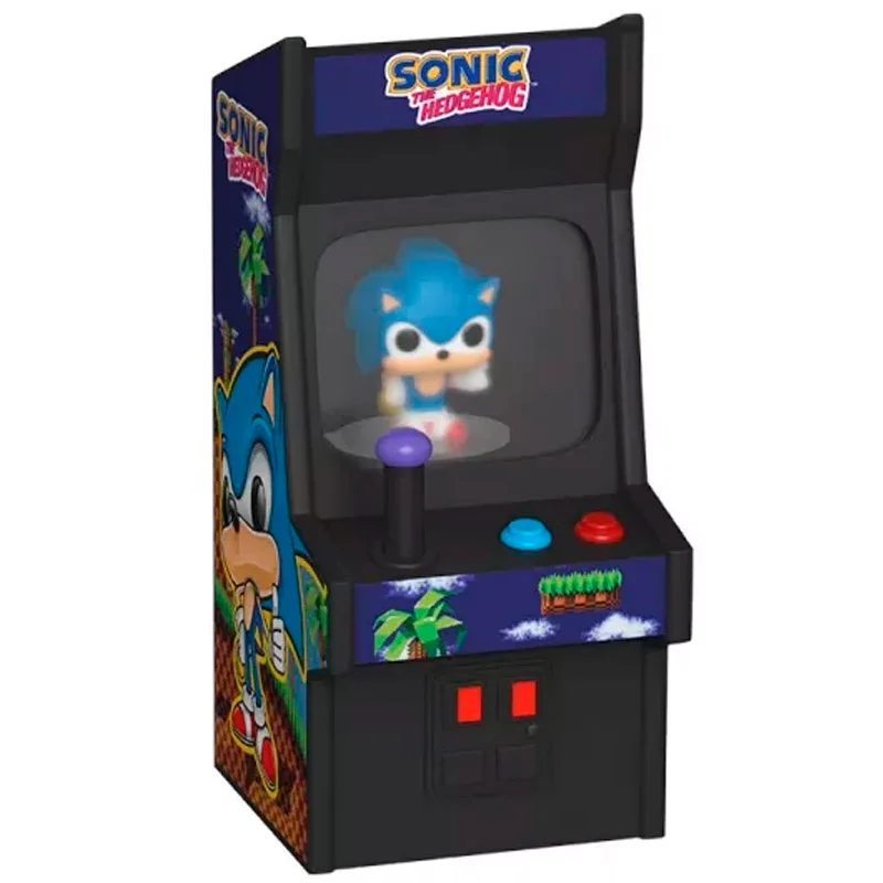 Sonic aparece en su versión más clásica: con sus zapatillas rojas, su actitud desenfadada y ese inconfundible toque rebelde que lo ha convertido en un icono intergeneracional. La máquina arcade que lo acompaña está decorada con los colores y gráficos del juego original, una auténtica explosión de nostalgia en tamaño reducido.