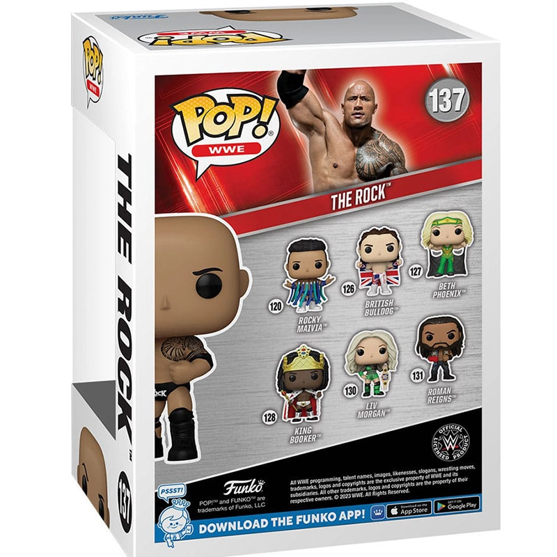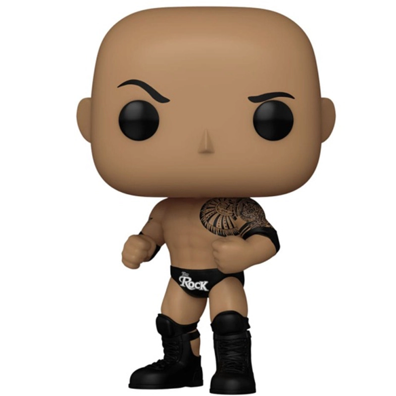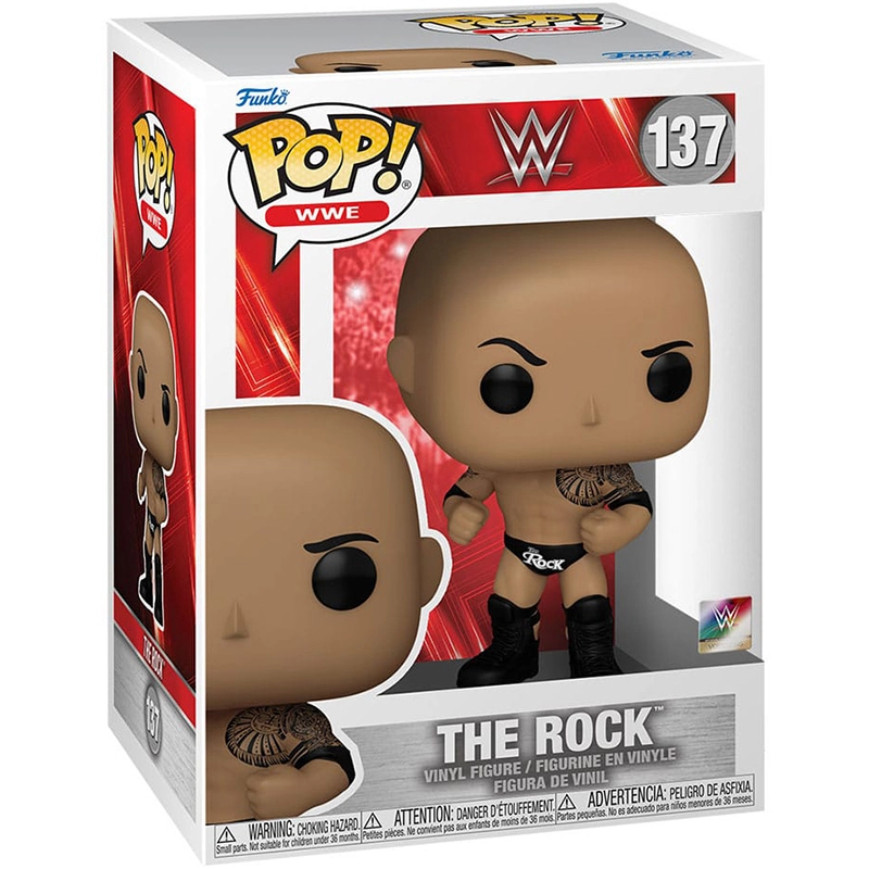Dwayne Douglas más conocido como La Roca. Este Funko de 9cm de tamaño representa a luchador de boxeo La Roca con bóxer negros con «The Rock» escritos en ellos, botas negras altas, tatuaje al hombre y puños cerrados. No te quedes sin tu muñeco FUNKO POP La Roca 137.