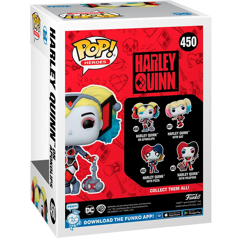 Harley Quinn es un personaje de los cómics de la franquicia DC. Este personaje era una gimnasta destacada donde realizaba piruetas y saltos extremos que le ayudaban a combatir. Esta figura de 9cm de tamaño representa Harley Quinn con unas de sus armas, en este caso, su mazo. Acompañado con una vestimenta roja y negra conjunto con sus ojos pintados de colores y sus moños. No te quedes sin el Funko Pop de Harley Quinn con Apokolips 450, ideal para ampliar tu colección.