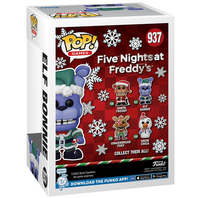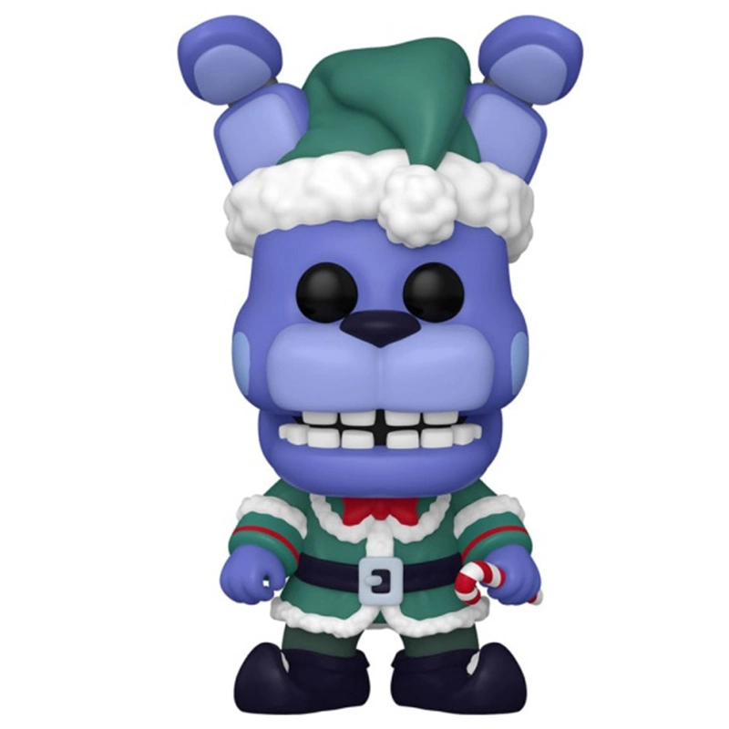 Elf Bonnie es un robot de color lila, en este Funko de 9 centímetros de tamaño representa a Elf Bonnie con gorro, chaqueta y zapatos de elfo con un bastón de caramelo en una de sus manos. No te quedes sin tu muñeco cabezón FUNKO POP Elf Bonnie 937.