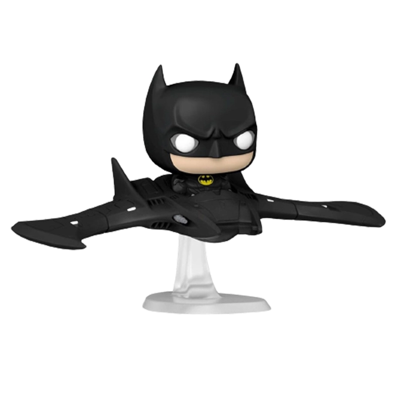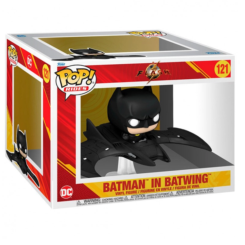 Este Funko 121 es especial ya que se trata de Batman montado en el batmobile, como si estuviera volando ya que esta sobre una base transparente simular esa sensación de vuelo.