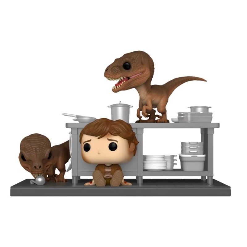 Tim Murphy es un personaje de las películas de Jurassic Park. Tim Murphy es un estadounidense entusiasta de los dinosaurios. Este Funko de 9cm de tamaño, representa a Tim escondido con cara de miedo detrás de una mesa de cocina para que no le encuentren los dos velociraptores. Estos dos velociraptores se encuentran uno encima de la mesa y otro aplastando una herramienta de cocina. No te quedes sin el Funko Pop Tim Murphy con Velociraptor 1199, ideal para ampliar tu colección.