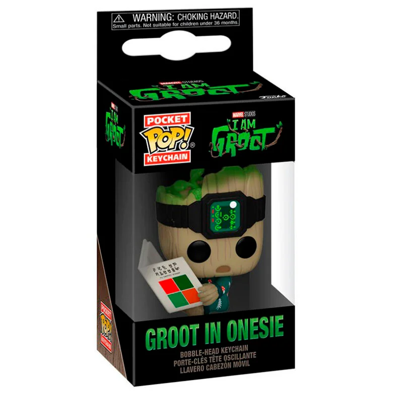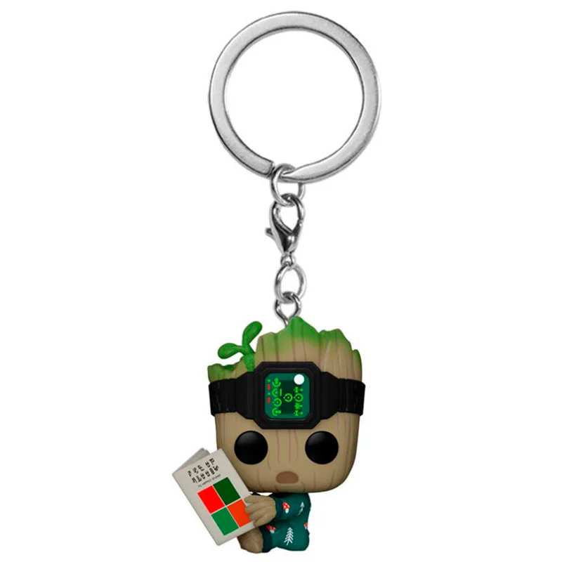 Este Pocket tienes que comprarlo para asi llevar siempre el llavero contigo. Además, muestra a Groot sentado leyendo un libro con cara de susto y con mono de color verde.