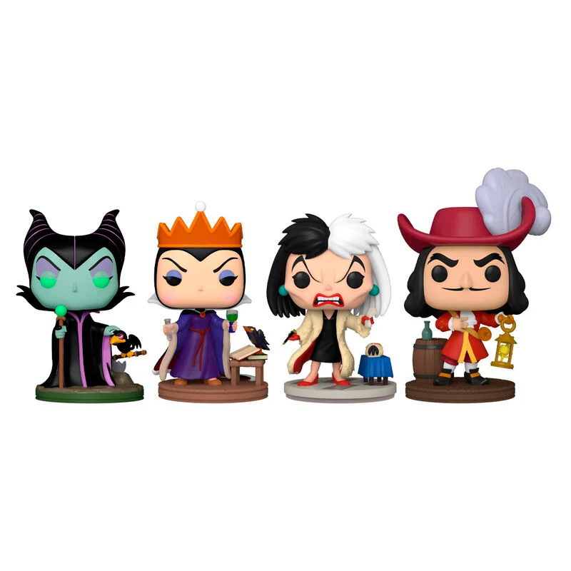 - Contenido: 4 Figuras Funko Pop (Maléfica, Reina Malvada, Cruella de Vil, Capitán Garfio).