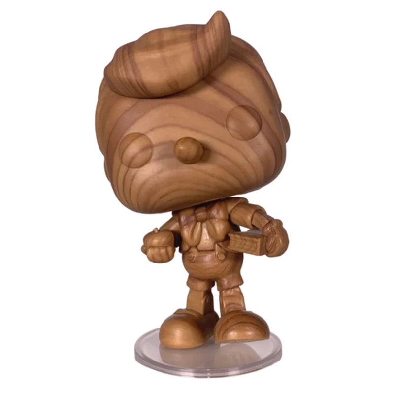 Este Funko 1029 es especial ya que se trata de una edición del personaje en la que se muestra en tonalidades de madera, simulando ser un títere original. Además, el personaje se encuentra con un libro en una mano y en otra una manzana.