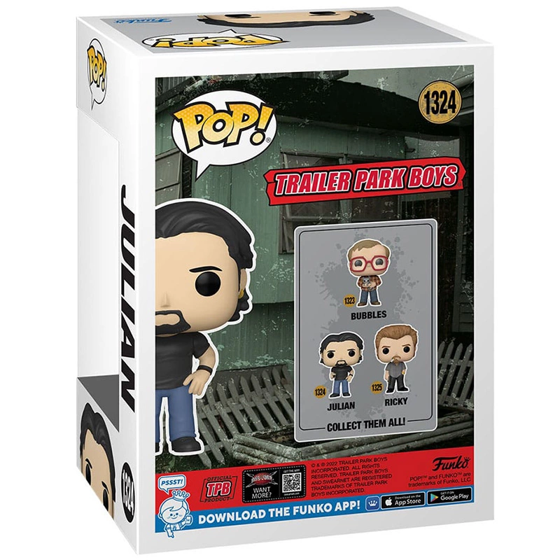 Julian más conocido como Jules es un personaje ficticio creado para la serie de televisión de Trailer Park Boys. El personaje es interpretado por el actor John Paul Tremblay. Este Funko de 9cm de tamaño representa a Julian con camiseta negra, pantalón vaquero y baso en mano. No dejes escapar la figura FUNKO POP Julian 1324.