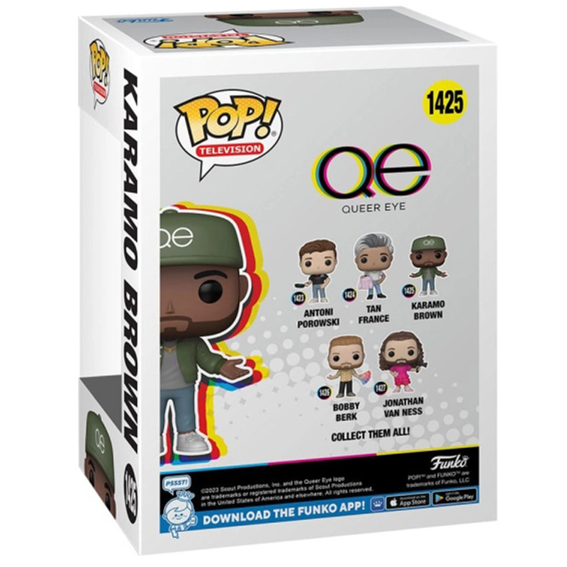 Karamo Brown es el presentador del reality de Queer Eye. Este Funko de 9cm de tamaño representa Karamo Brown con vaqueros, deportivas, camiseta gris, chaqueta verde y gorra del mismo color con las iniciales del reality QE. No te quedes sin tu muñeco FUNKO POP Karamo Brown 1425.