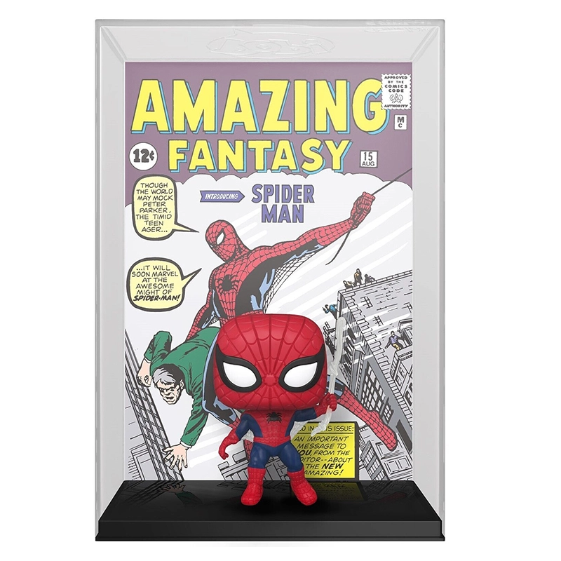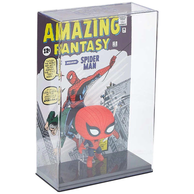 Este Funko número 05 es especial ya que se trata de una versión comic cover, es decir, detrás de la figura se encuentra la portada del comic «Amazing Fantasy» más una caja de protección de metacrilato.