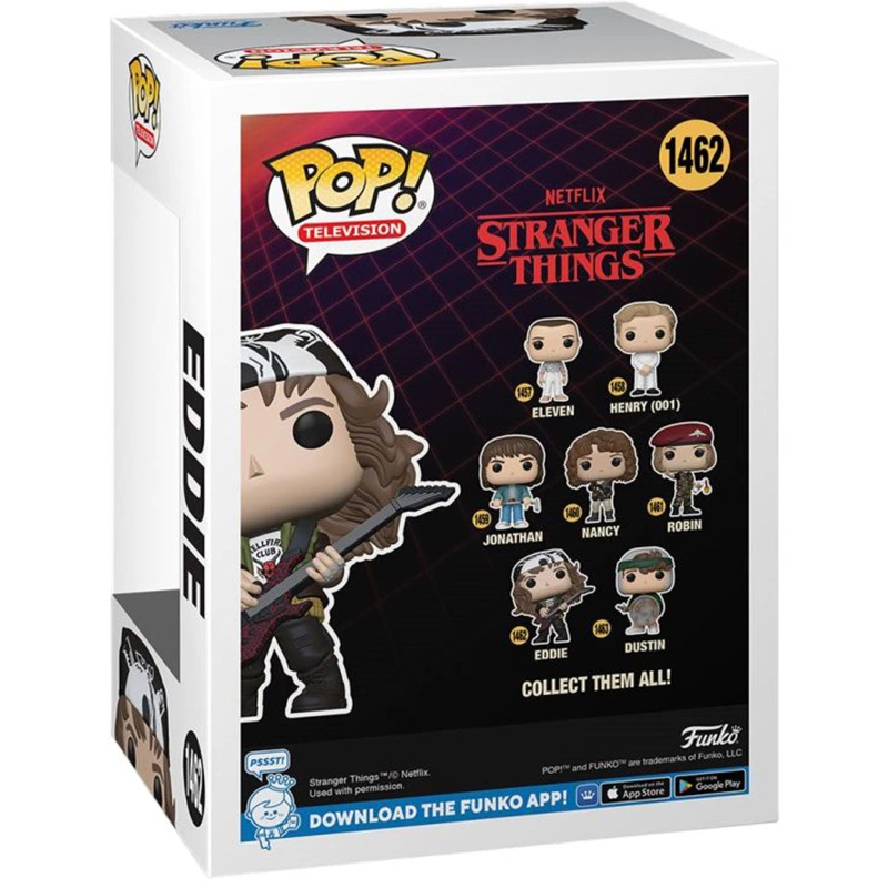 Este Funko 1462 es especial ya que se muestra al personaje tal y como aparece en la serie de streaming, siendo uno de los personajes centrales y líder del Hellfire Club en la Escuela Secundaria Hawkins. Eddie esta interpretado por Joseph Quinn.